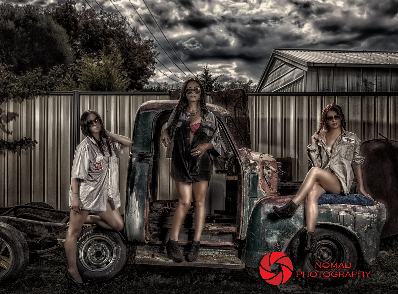 As illustrated, I used two lights for my setup, one as main light on camera right and a bare bulb light for extra wrap, with the sun in the back of the models (shadows on the grass). You can also see our BTS man, Michael Watson, in action with the behind the scene video that I hope will be put up very soon.