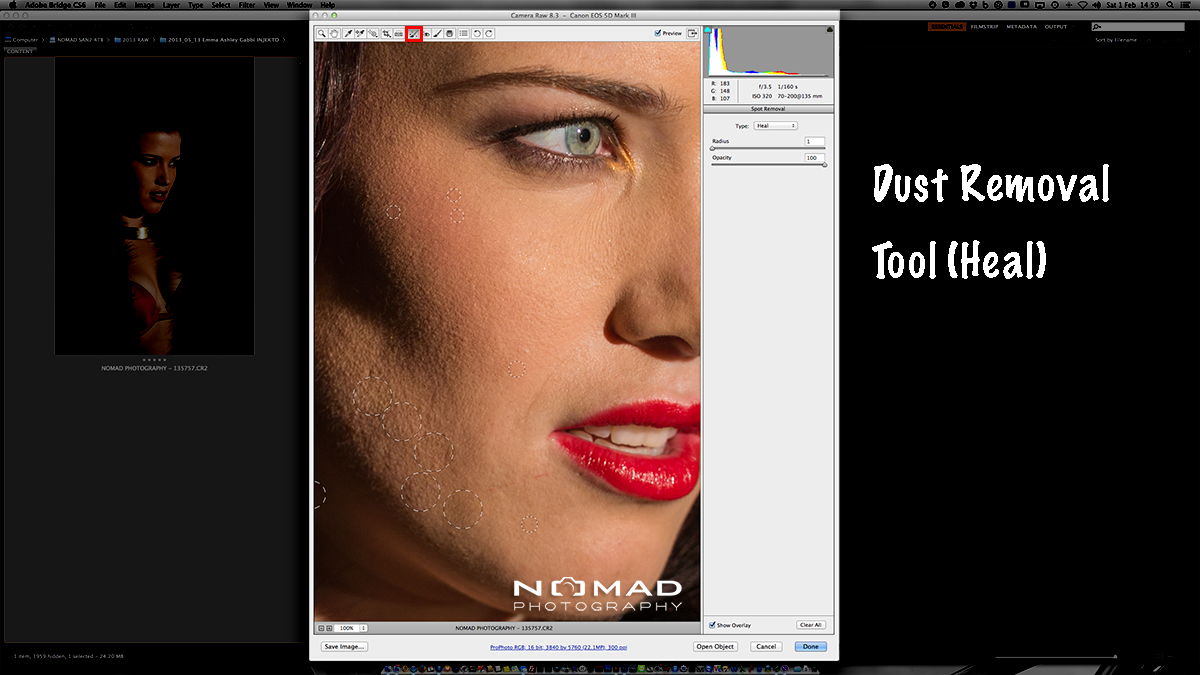 Select the dust removal tool (red) and click and drag on the areas where you want to ‘heal’